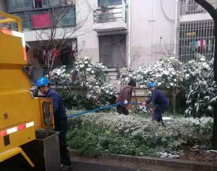 圖為管網養護員冒雪在柯橋街道紅升景園疏通生活污水管道