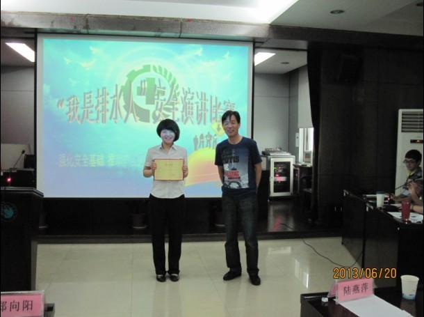 參賽選手在講的同時以PPT為背景為大家展示演講內(nèi)容,觀點鮮明,立意深刻,語言表達(dá)自然流暢,本次比賽結(jié)合“我是排水人”主題教育,以“強(qiáng)化安全基礎(chǔ)、推動安全發(fā)展”為線索,體現(xiàn)了排水人積極向上的精神風(fēng)貌。最后來自柯海分公司的林佳獲得第一名,由鄭書記親自頒獎。