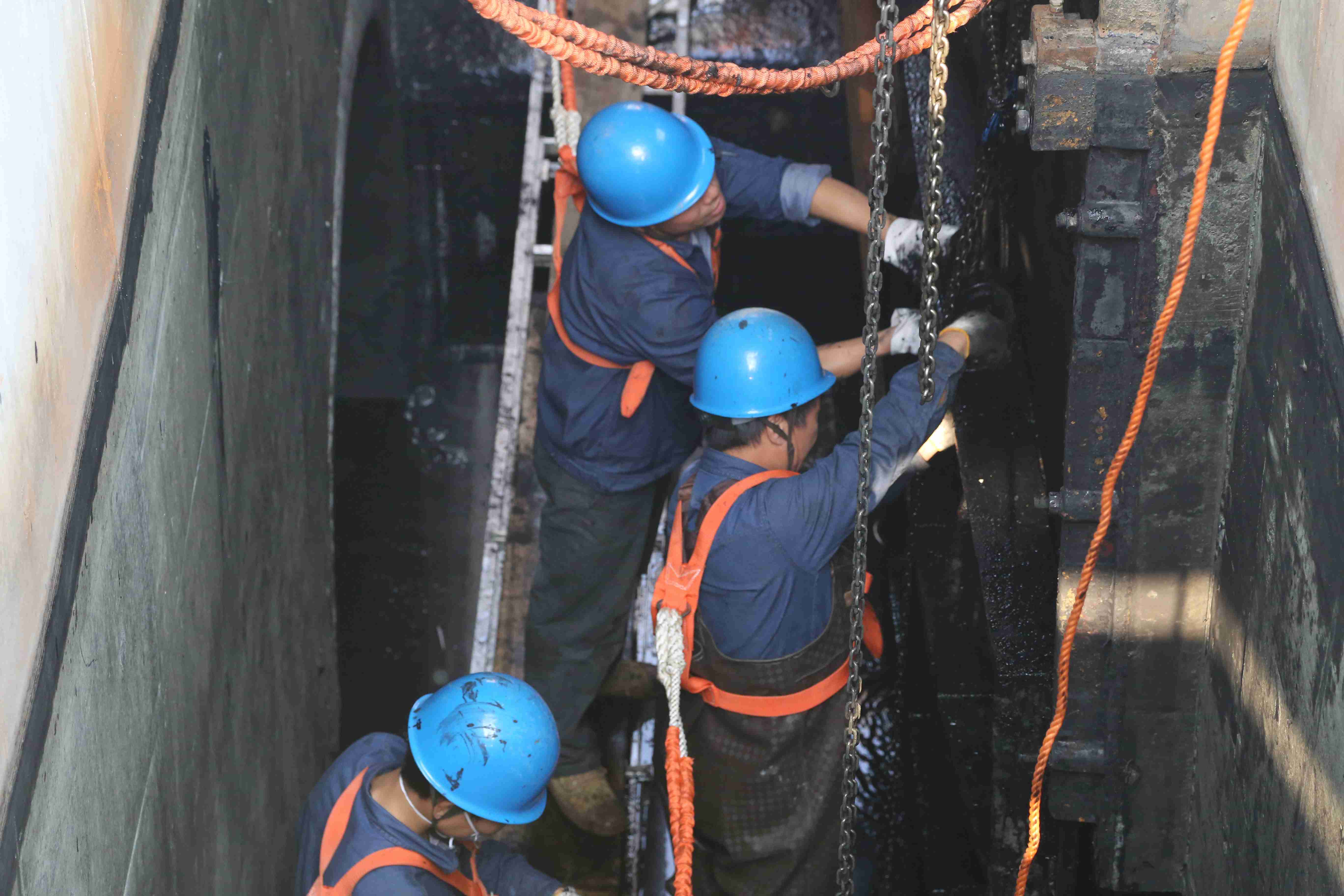 此次維修工作地點全程為混凝池池底,面對池底污泥層厚、空間狹窄等難題,公司前期組織維修人員、安全員等多次進(jìn)行方案探討并確定3套維修方案;在維修工作進(jìn)行過